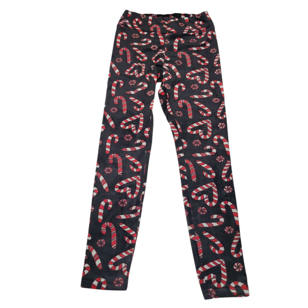 Candy Cane Leggings Fleece Soft Warm Black Red Christmas Holiday Girls Medium