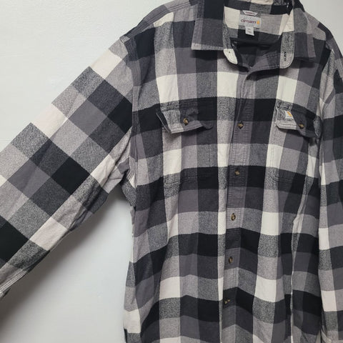 Carhartt Flannel Button Down Shirt Gray Plaid Plaidurday 906 Yooper Mens 2XL Measurements in the photos for best fit.