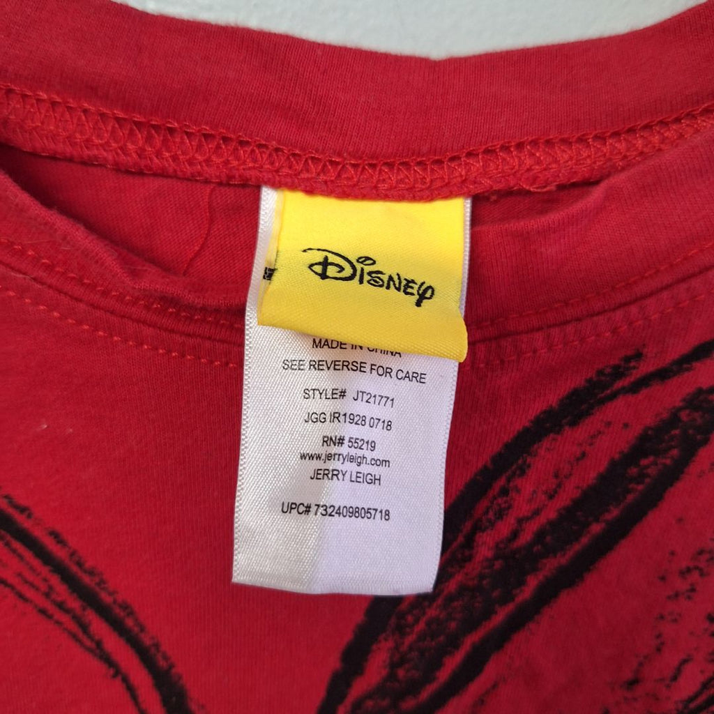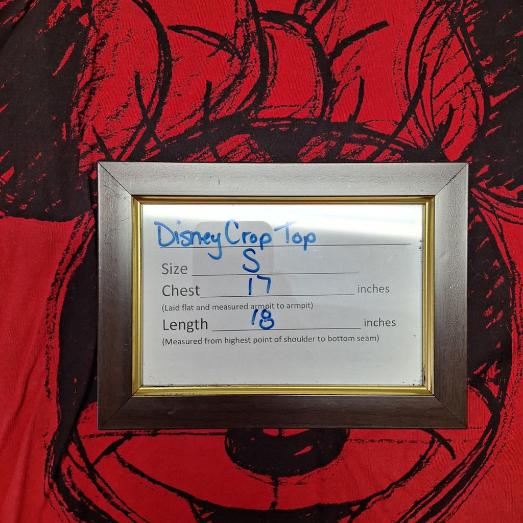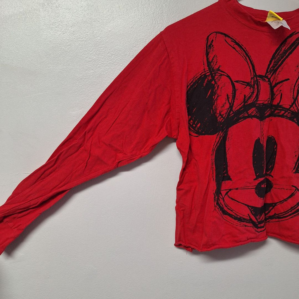 Disney Cropped Shirt Minnie Mouse Red Black Womens Small Rolled Raw Hem Measurements in the photos for best fit.
