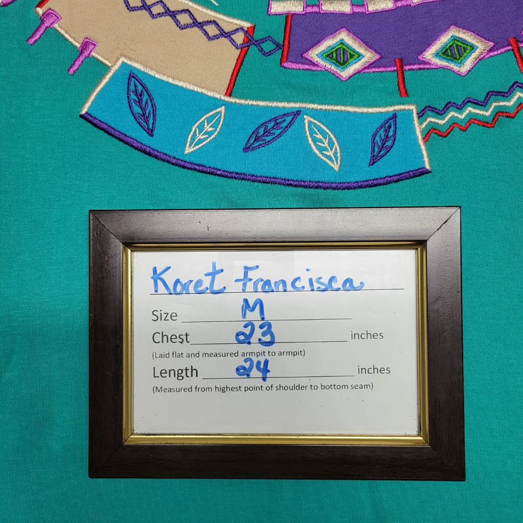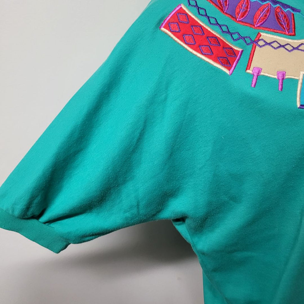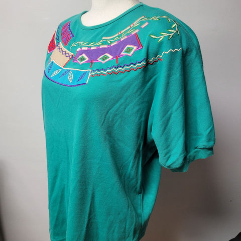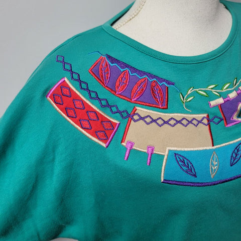 Koret Francisca Shirt Green Embroidered 80s Shoulder Pads Vintage Womens M Tribe This vintage item may have different sizing than modern items. Measurements in the photos for best fit.