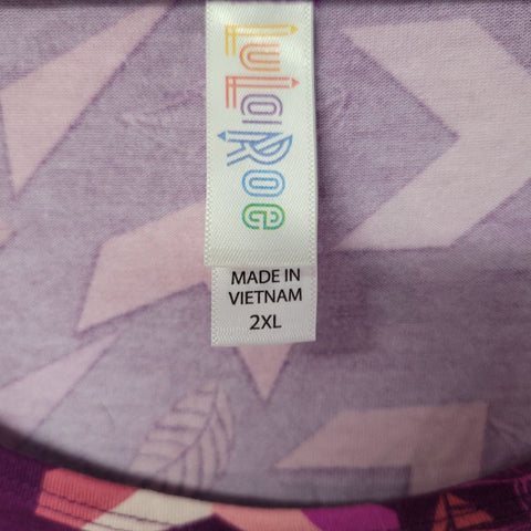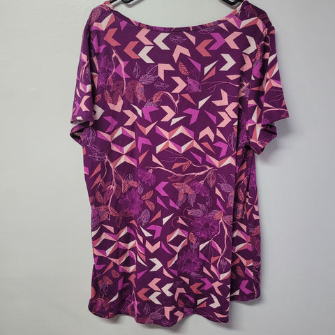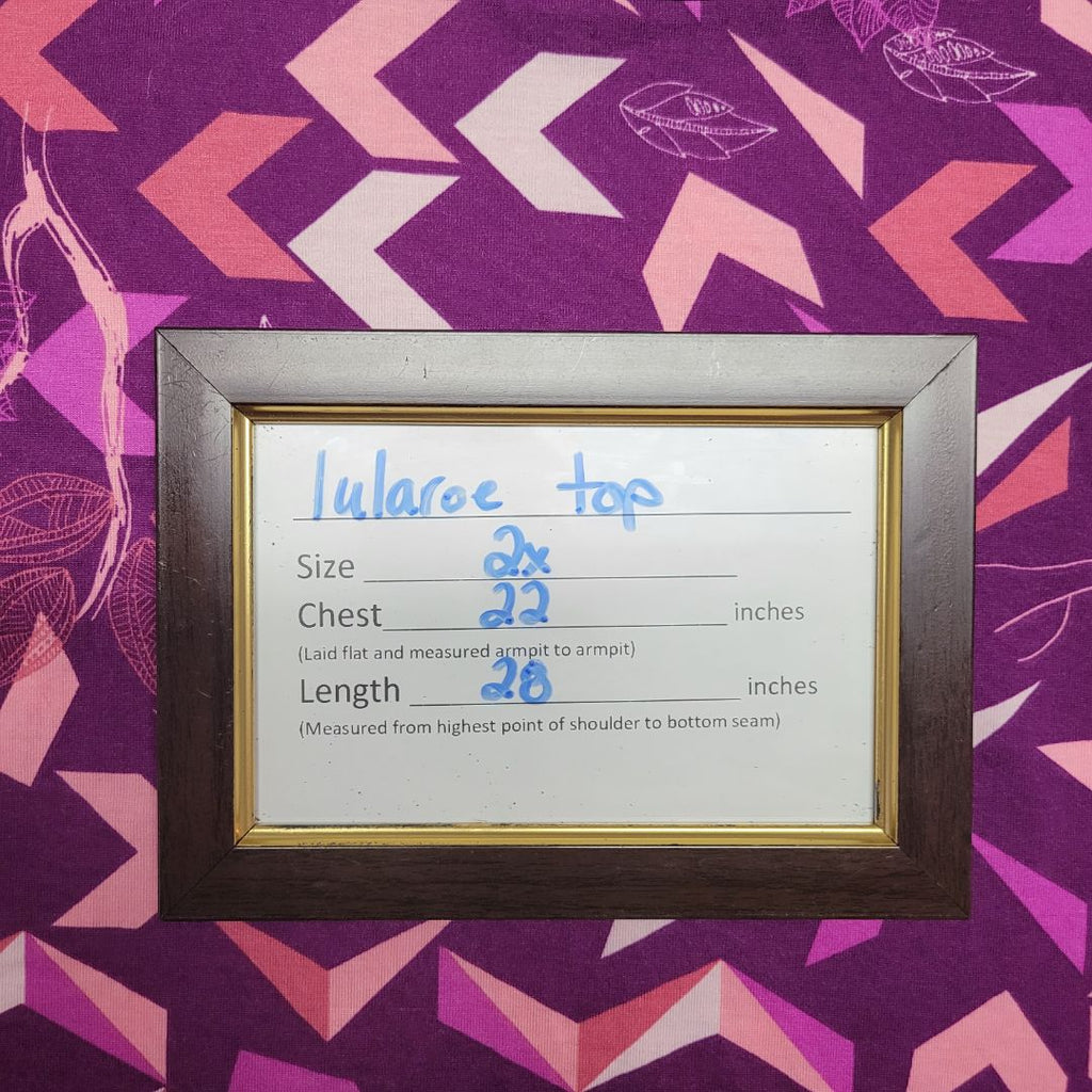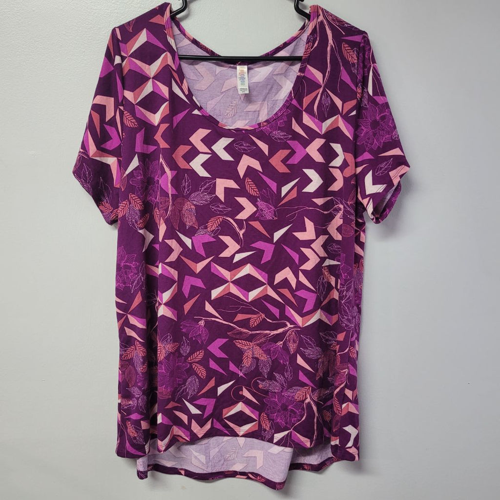Lularoe Top Shirt Short Sleeved Purple Pink Geometric Leaves Womens 2XL Classic Measurements in the photos for best fit