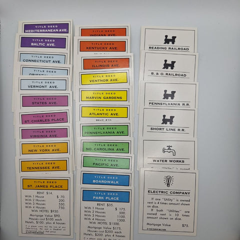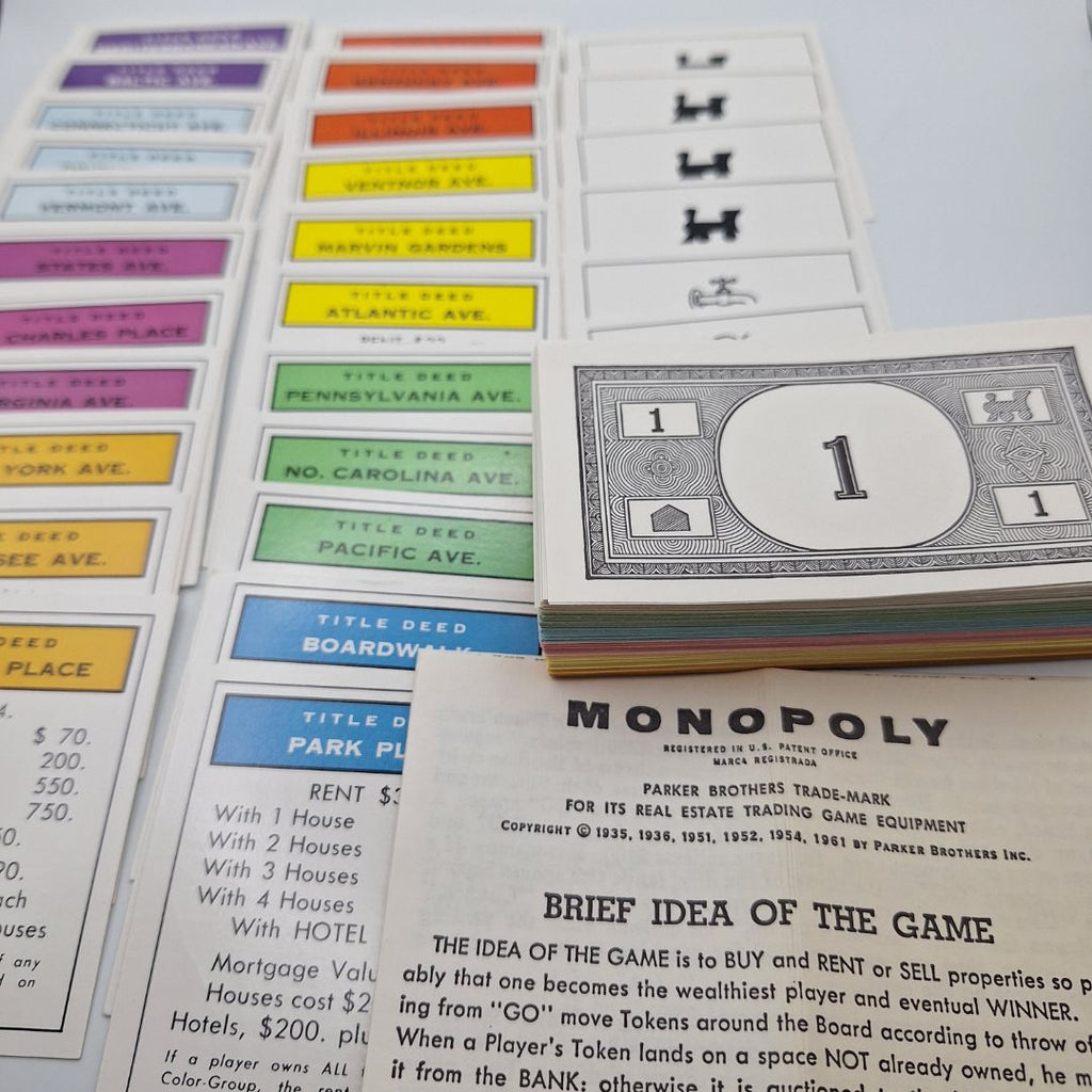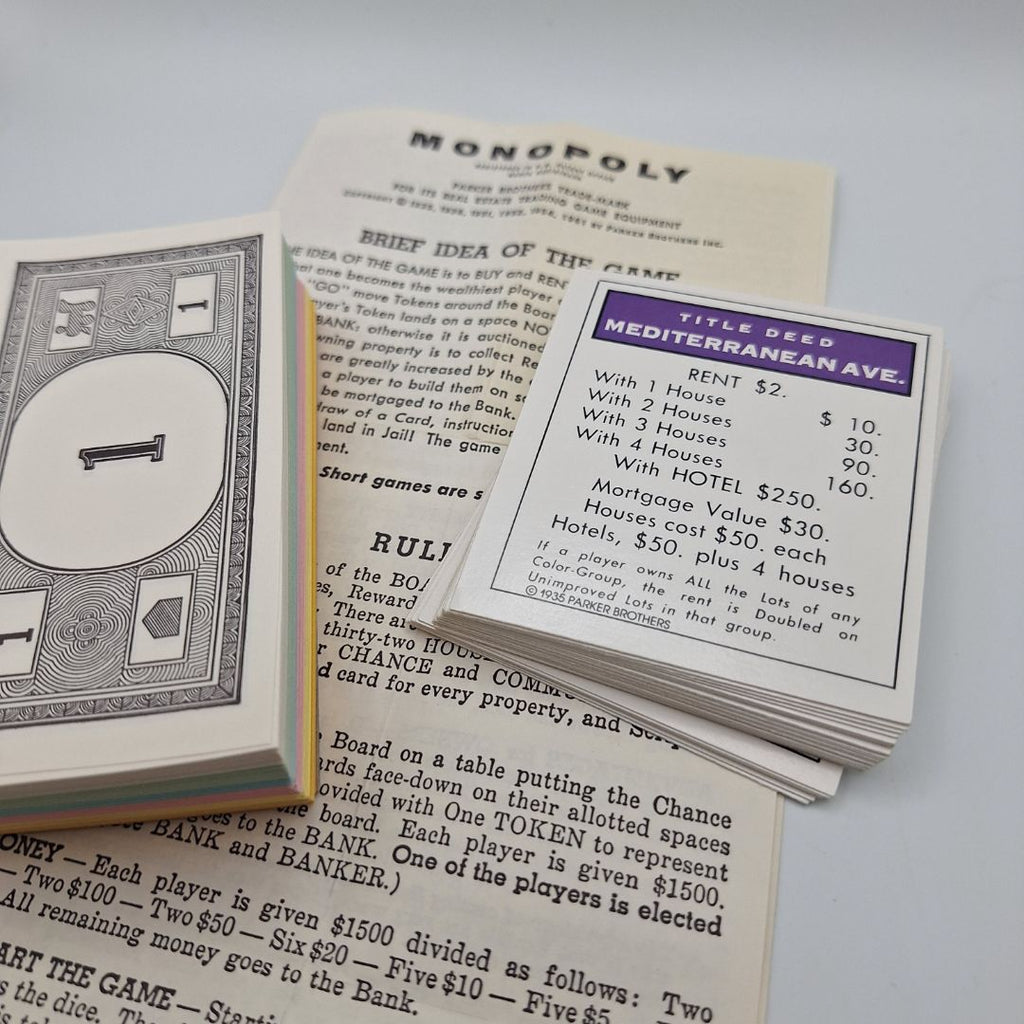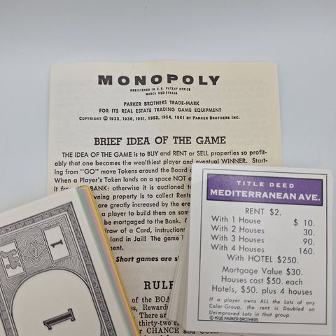 Monopoly Replacement Deed Pieces Instructions Rules 1960s Vintage Property Money Money, deeds, and instructions from a vintage 1960s game.