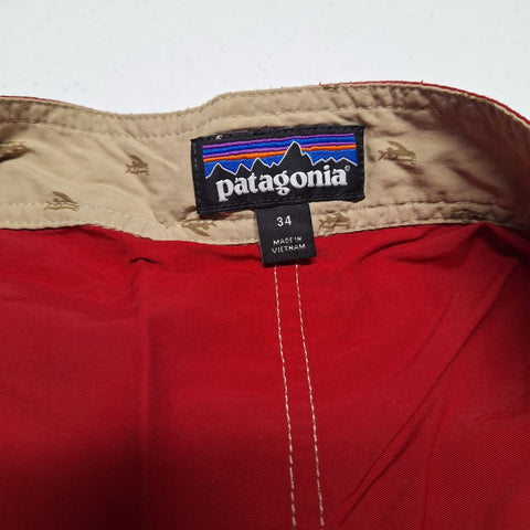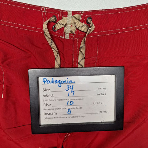Patagonia Board Shorts Common Threads Red Drawstring Pockets Mens 34 Swim Trunks Small mark on front as shown. Measurements in the photos for best fit
