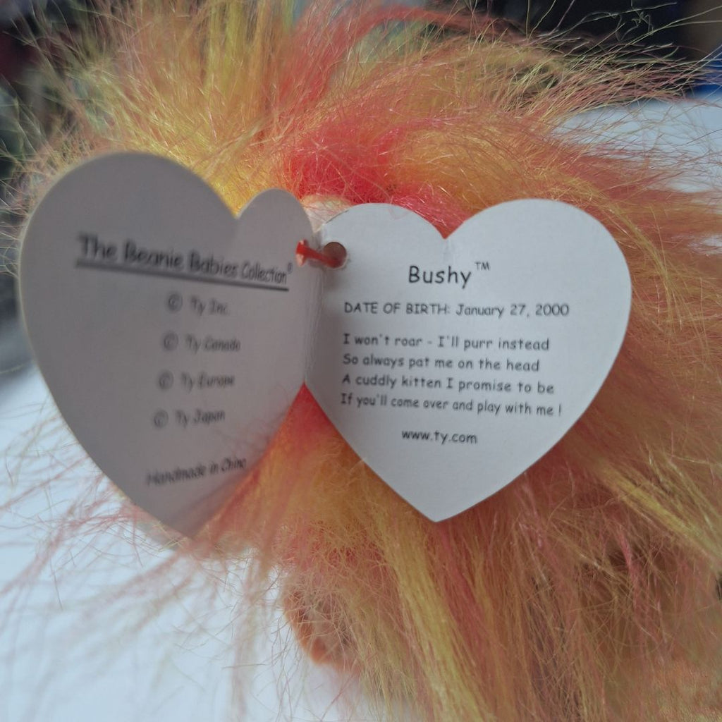This vintage Ty Beanie Baby Bushy Lion Plush from 2000 is a delightful addition to any collection. With its vibrant neon orange color and jungle theme, it captures the playful essence of a lion in plush form, perfect for both collectors and plush enthusiasts.