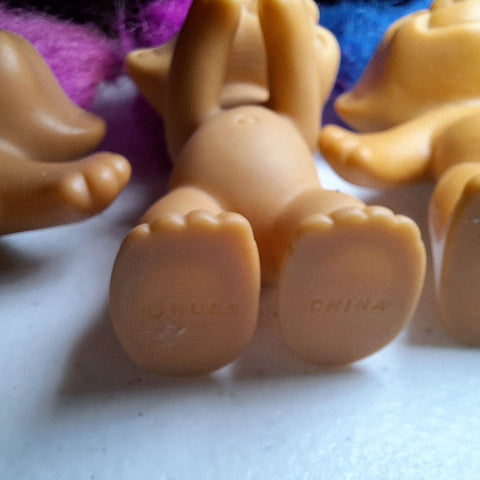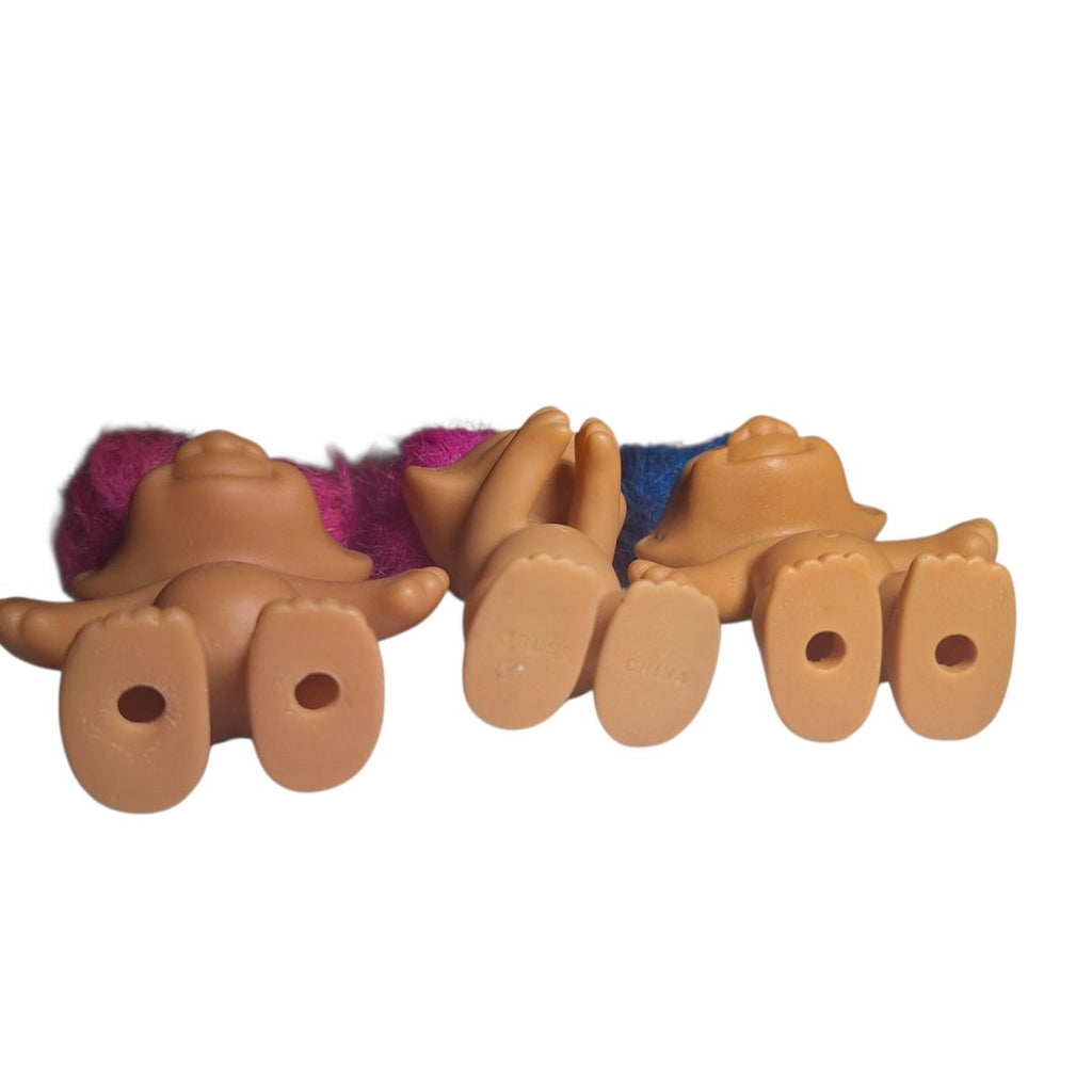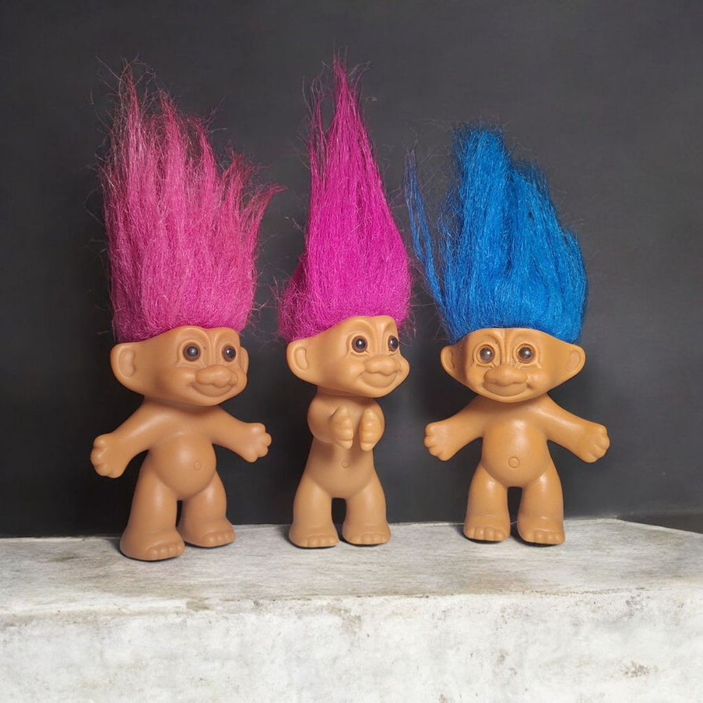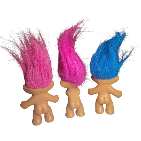 Vintage Troll Dolls Small Short Set of 3 Pink Blue Hair Russ Berrie 80s 90s Toy Set of 3 different troll dolls all about 3 inches tall plus hair.