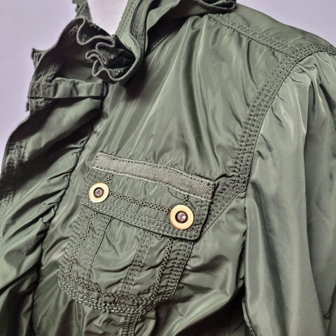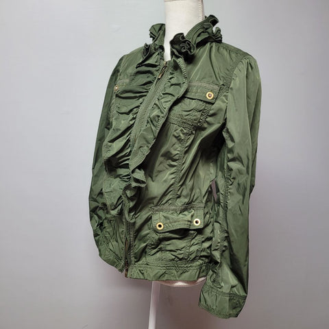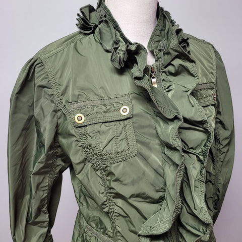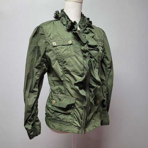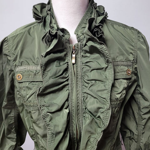 White House Black Market Ruffle Jacket Zip Pocket Green Womens Small Lightweight Measurements in the photos for best fit. inside seam ripped as shown. No belt included. Belt loops intact.